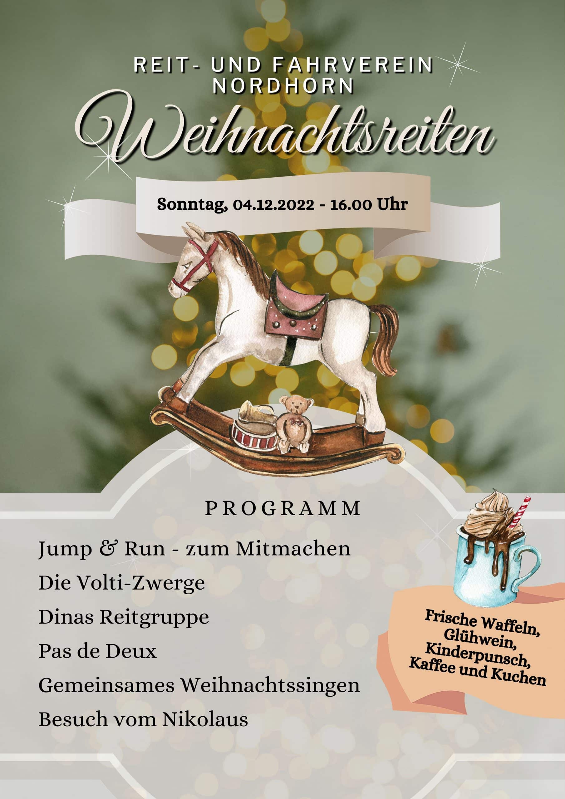 Wir freuen uns auf einen tollen Nachmittag mit weihnachtlichem Feeling, tollen Besuchern und einem buntem Programm. Hierbei werden natürlich Glühwein, Punsch, Kaffee und Leckereien wie frische Waffeln und Kuchen nicht fehlen. Wir freuen uns auf euch!